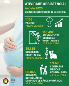 Em 2025 a Unidade Local de Saúde do Oeste reforçou a sua atividade assistencial face ao ano anterior. Dados apurados demonstram um acréscimo no número de sessões de Hospital de Dia (+25,2 %), Partos (+12,1 %) e Consultas (+3,1 %). Por sua vez, os atendimentos nas urgências hospitalares diminuíram significativamente (-17,1 %), analogamente a 2024. No que concerne à atividade desenvolvida em Hospital de Dia, verificou-se um aumento bastante expressivo no passado ano de 2025. Foram realizadas 25.535 sessões, um acréscimo de 25,2 % (mais 5.141) face ao acumulado de 2024.