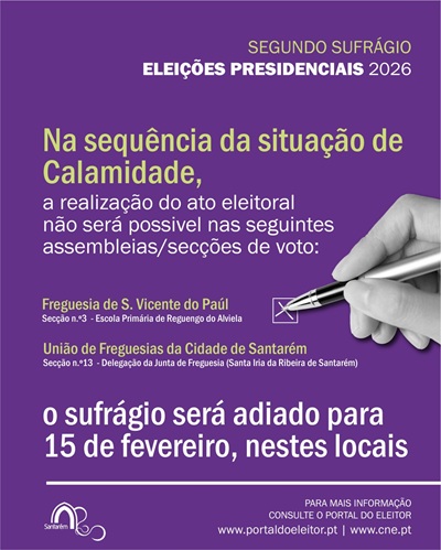 Na sequência da situação de calamidade decretada para o Concelho de Santarém, a qual compromete as condições de segurança, acessibilidade e o funcionamento regular das assembleias e secções de voto, torna-se impossível a realização do ato eleitoral inicialmente previsto para o dia 08 de fevereiro de 2026, nos seguintes locais: